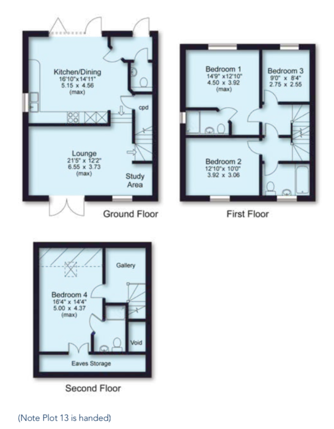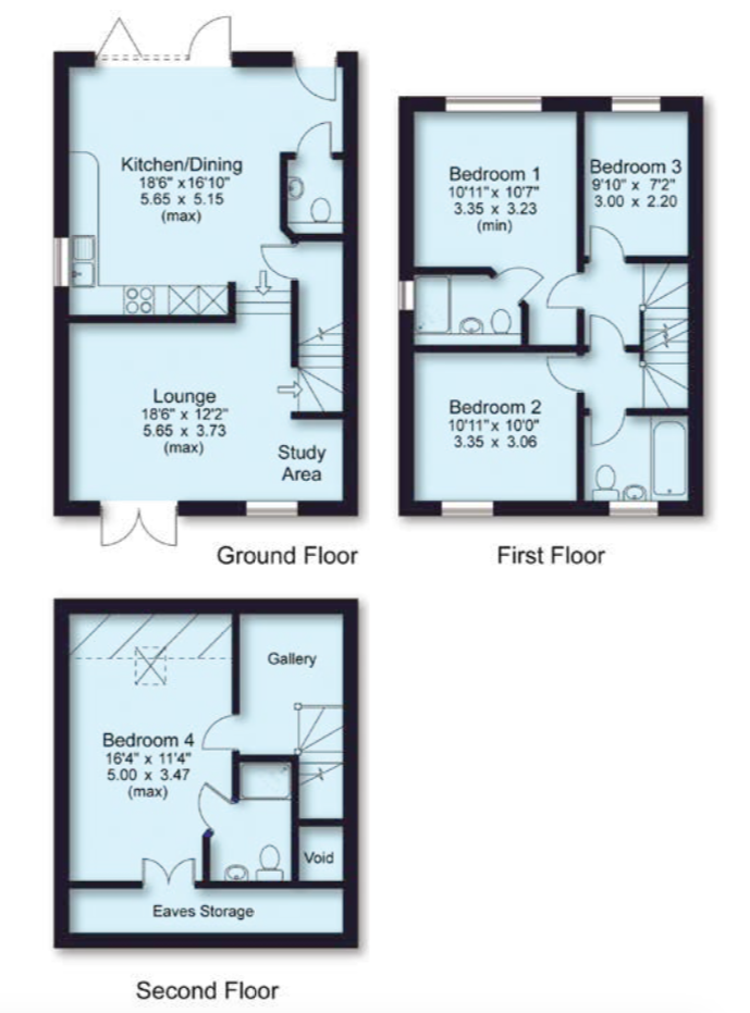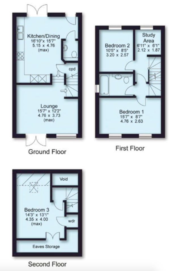 These three bedroom, three-storey homes boast an open plan modern kitchen/ dining area and separate living room. Patio doors open the property up to both the rear and front aspects. The first floor comprises the master bedroom, a single bedroom, study and family bathroom. The property is completed by a further double bedroom to the second floor.